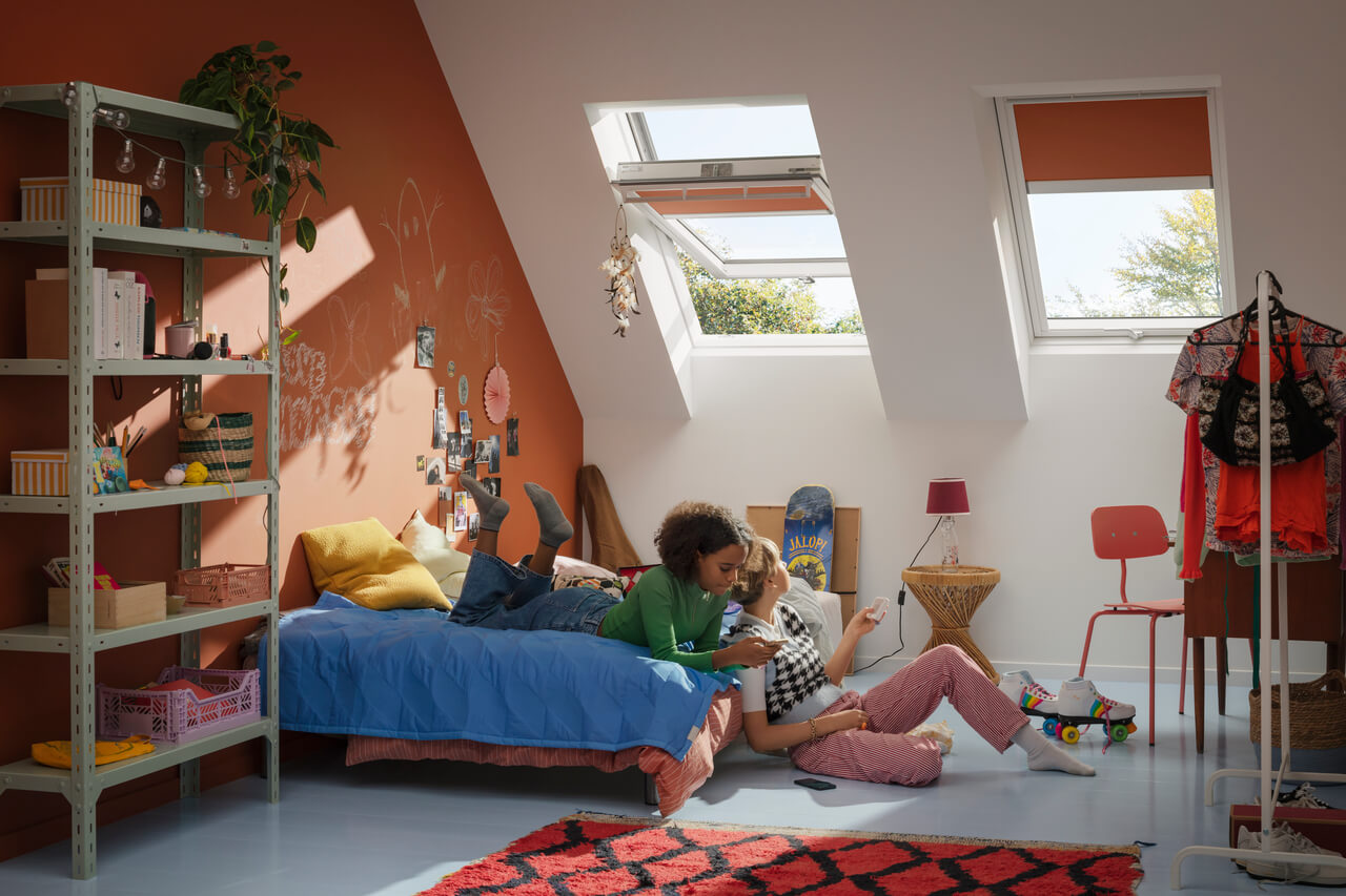 Para melhores resultados, combine persianas com outros acessórios VELUX: numa sala pequena, por exemplo, combine uma persiana interna com uma persiana com bloqueio de calor, e adicione uma rede mosquiteira para que os seus filhos possam dormir tranquilamente durante o dia e à noite, sem se preocuparem com o calor e com os insetos.