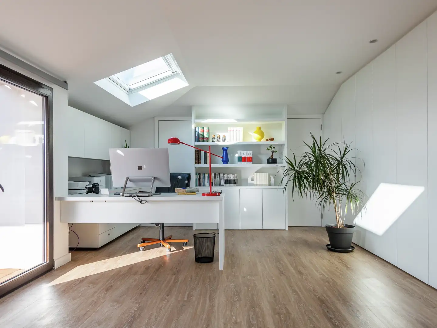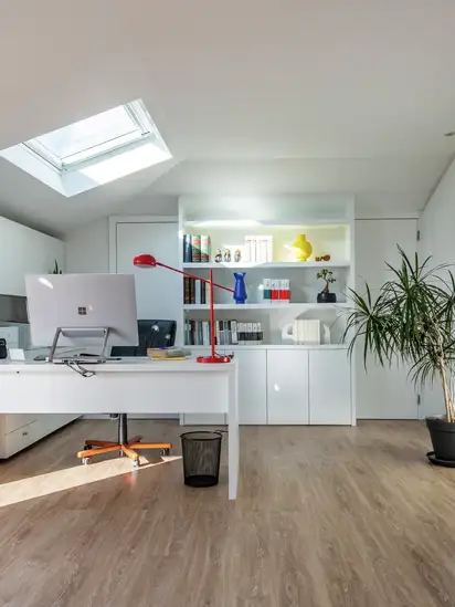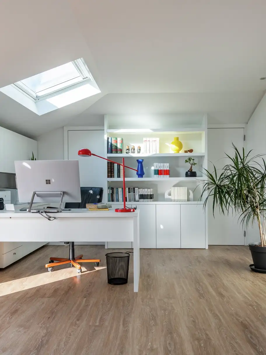 “O arquiteto que pensou no nosso projeto tinha uma opinião muito vincada sobre as janelas: quanto maiores, melhor. E na altura decidiu colocar duas janelas VELUX tendo em consideração dois fatores: por um lado a zona de trabalho, e por outro lado a zona do corredor/escadas que acabava por iluminar também a parte de baixo da casa. As janelas servem agora também para fazer a divisão do espaço, o que resulta muito bem.”