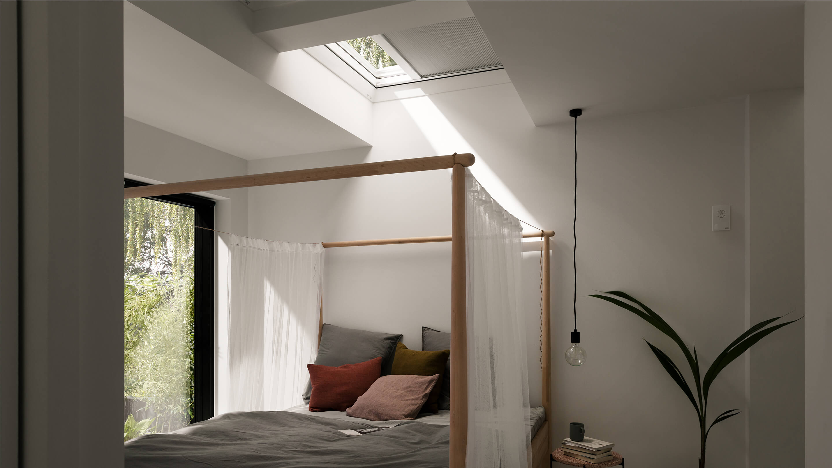 As cortinas plissadas translúcidas da VELUX para janelas de telhado plano proporcionam um controlo suave da luz do dia.
