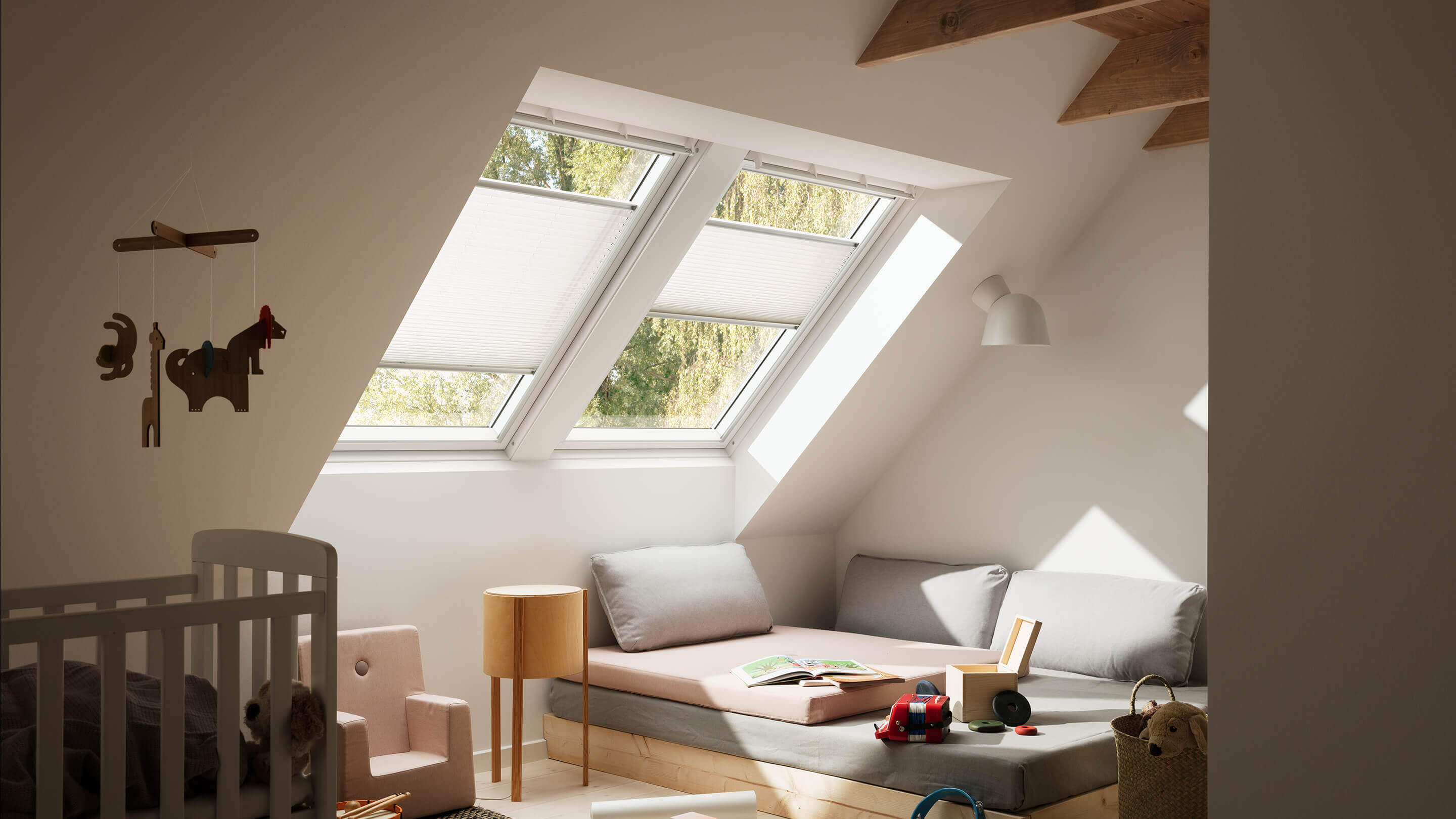 As cortinas plissadas VELUX são decorativas e ajudam a atenuar a entrada de luz e escurecer divisões.