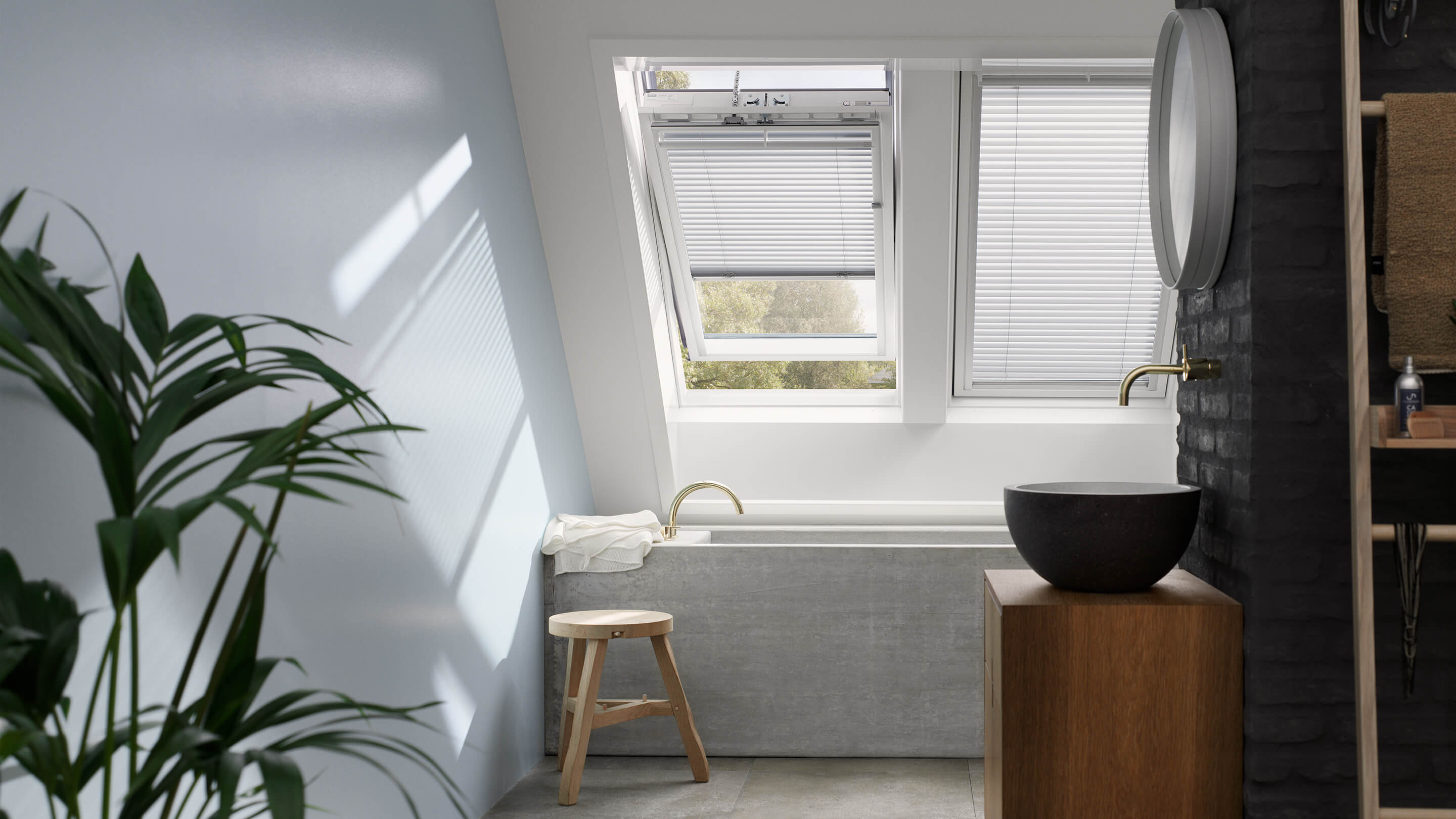 Os estores venezianos VELUX são perfeitos para locais húmidos e ajudam a atenuar a entrada de luz.